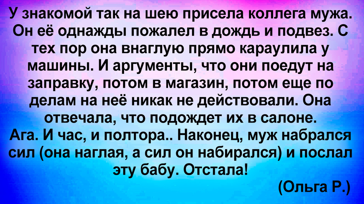Иногда хочешь сделать доброе дело, а оно еще против тебя заиграет веселыми красками. Не зря же говорят: Сделал добро - успей увернуться от пинка благодарности! Буквально на днях. Мы на хуторе живем, вокруг деревни и села. Утром отвожу мужа на работу ( вернее он за рулем, а я потом машину забираю и домой). Тормозит нас по дороге дама почтенного возраста, и говорит - добросьте до райцентра. И главное лезет уже в машину и тележку свою пихает. Муж со смехом говорит, мы вообще в Т. (совершенно в противоположную сторону). Так она обиделась - ездют тут всякие! Мешают только! (kyaza) История 3 kyaza, меня муж встречал с электрички и отвозил на дачу. Спокойно иду, веду собаку. Смотрю, какая-то дама открывает дверь нашей машины и плюхается на переднее сиденье.. Муж обалдел! Подхожу к машине, говорю выходите. Та: я раньше прибежала. -Мой это муж! - говорю. - встречает меня, а не вас. -Всё равно меня везите. Тут собака подала голос, и дама выскочила из машины. 🥴 (НМ) Отвозила я мужа на поезд