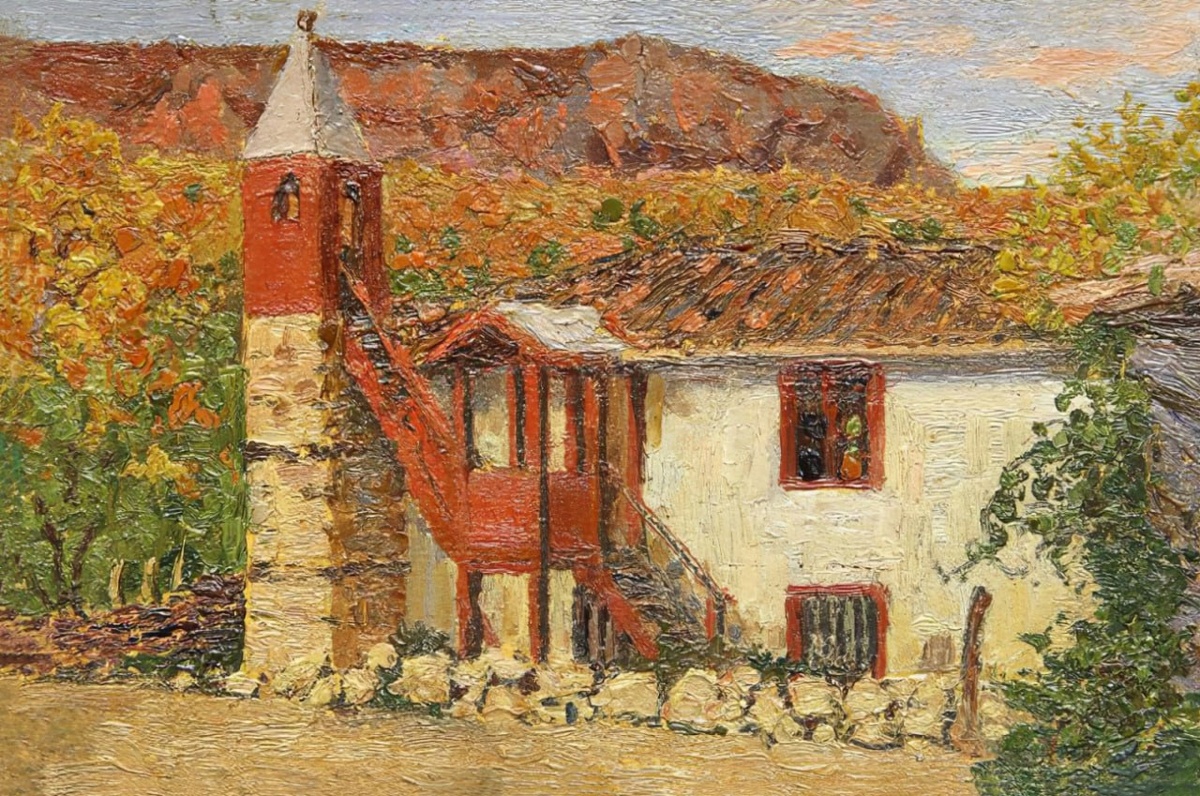 Журбий Иван Емельянович Сельская мечеть в Коракозах Конец 19 или начало 20 века Из фондов: Алупкинский дворцово-парковый музей-заповедник. Журбий Иван Емельянович (1884-1946) - русский и советский художник-живописец. Родился в Ялте. Художественное мастерство сложилось под влиянием русской реалистической школы пейзажной живописи. Принимал участие в выставке „Искусство в Крыму” вместе с И. Билибиным, Л. Брайловским и ДР. На картине изображена белостенная сельская мечеть на фоне охристо-коричневых гор, слева к ней примыкает минарет. #Живопись #графика #искусство #архитектура