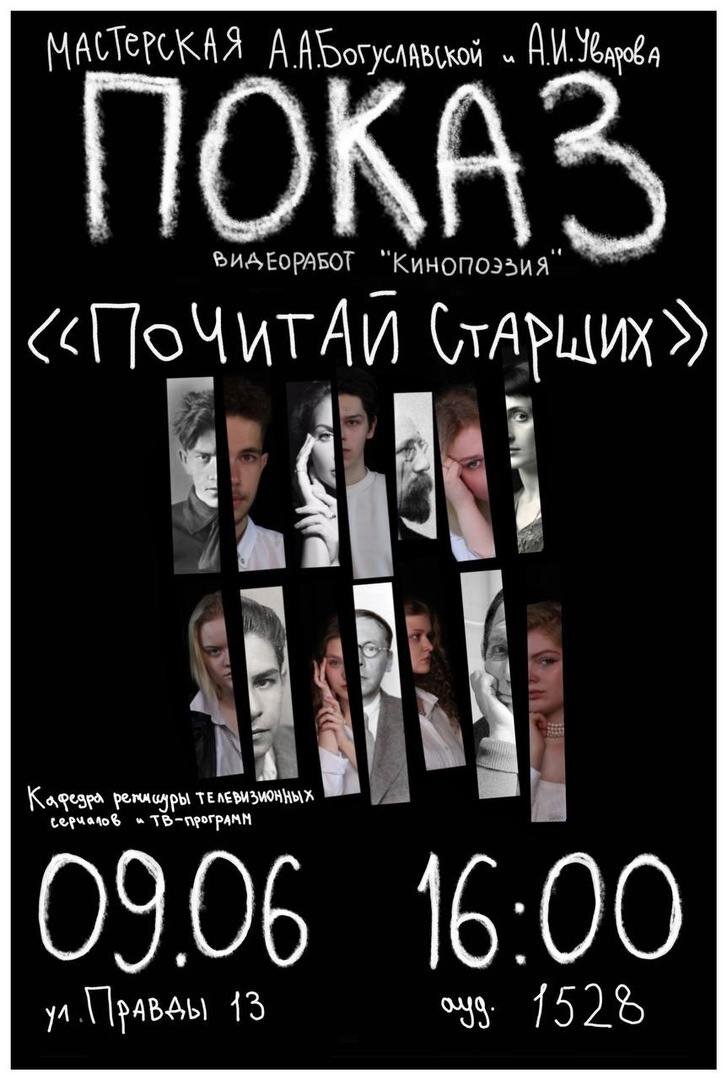 Первокурсники кафедры режиссуры ТВ-сериалов и ТВ-программ ГИКИТ мастерской Анны Богуславской и Алексея Уварова представят свои видеоработы КИНОПОЭЗИЯ. Вы окунётесь в мир, где слова становятся образами✨