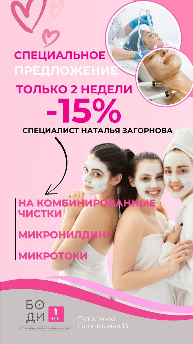 ✨СПЕЦИАЛЬНОЕ ПРЕДЛОЖЕНИЕ✨ ⏳ТОЛЬКО 2 НЕДЕЛИ — -15% 👩💼 СПЕЦИАЛИСТ: Наталья Загорнова 💎 На комбинированные чистки + микронидлинг + микротоки! 🧖♀️ Эффективно! Современно! Профессионально! 👉 Улучшение текстуры кожи 🌟 👉 Борьба с возрастными изменениями 💫 👉 Омоложение и здоровое сияние изнутри 💖 🔥 Успейте воспользоваться предложением! 📍 Боди топ Путилково, Просторная 13 📲 Запись https://n960947.yclients.com