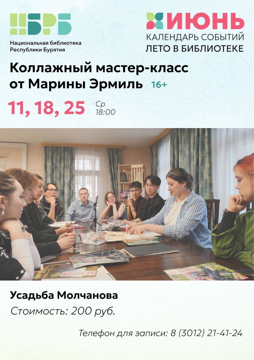 Нечем занять себя летом? В Национальной библиотеке проведут коллажные мастер-классы Занятия пройдут в рамках проекта «Лето в библиотеке» В программу проекта «Лето в библиотеке» на июнь добавились мастер-классы по созданию коллажей, который проведет сотрудница Национальной библиотеки Бурятии Марина Эрмиль. Мастерица занимается коллажами более 10 лет, а также создает украшения, закладки для книг, блокноты и многое другое. Мастер-класс пройдет по средам (11, 18 и 25 июня) в 18:00 в Усадьбе Молчанова Национальной библиотеки. Стоимость занятия: 200 рублей. Количество мест ограничено. Записаться на мастер-класс можно через сообщения группы Национальной библиотеки в ВК (https://vk.com/library_of_buryatia) или по телефону: 21-41-24, добавочный 185.