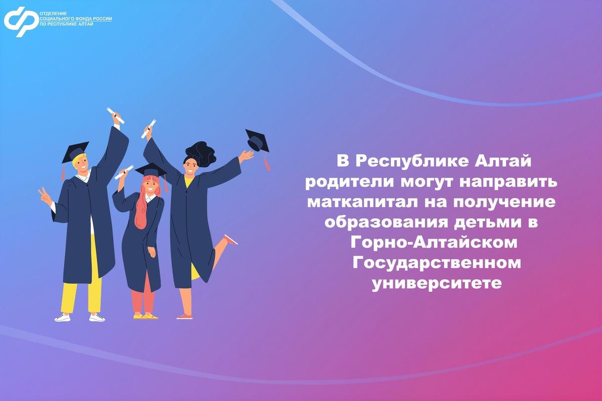 В Республике Алтай родители могут направить маткапитал на получение образования детьми в Горно-Алтайском Государственном университете В мае 2025 года Отделение СФР по Республике Алтай и Горно-Алтайский госуниверситет заключили соглашение, в соответствии с которым владельцы сертификатов на материнский капитал могут подать заявление на распоряжение им через вуз. Такое заявление можно подать, если владелец сертификата заключил договор об оказании платных образовательных услуг именно с Горно- Алтайским Государственным университетом. Заявление о распоряжении средствами материнского капитала можно подать одновременно с заключением договора, о принятом по нему решении вуз проинформирует владельца сертификата. Для подачи заявления о распоряжении через ГАГУ никаких дополнительных документов не требуется. Сведения из договора об оказании платных образовательных услуг одновременно с заявлением в ОСФР по Республике Алтай направит сам университет. Дополнительную информацию можно получить по телеф