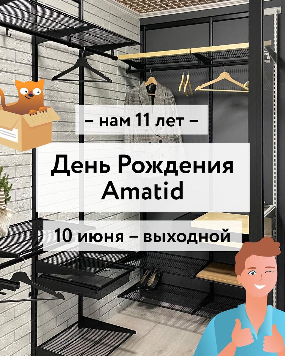 Уважаемые подписчики, в День Рождения фирмы у нас выходной. Мы все – дружная команда и хотим провести этот праздник вместе. Поэтому: – 10 июня офисы и салоны не работают. – Запросы, поступившие 10 июня, будут обработаны 11 числа. Обещаем продолжать радовать вас продуманными гардеробными, бесшумными дверьми-купе и индивидуальными проектами точно в срок!) Всем спасибо заранее за понимание и поздравления!))