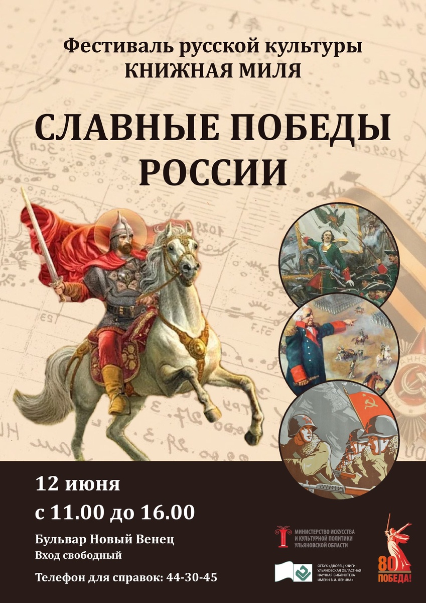 🛡️Приглашаем на Фестиваль русской культуры "Книжная миля: Славные Победы России!" 🇷🇺В День России 12 июня с 11.00 до 16.00 на бульваре Новый Венец гостей и жителей Ульяновска ждёт увлекательная литературно-познавательная программа с книжными экспозициями, мастер-классами, играми, викторинами, литературным подиумом, встречами с писателями! Площадки фестиваля будут посвящены истории наших побед от Невской битвы до настоящего времени. 👨👩👦Станьте гостями "Книжной мили" и вспомните значимые сражения в истории Отечества, совершите путешествие во времени от эпохи русских богатырей, ратников и стрельцов до воинов современной армии, пройдите по следам героев сражений и войн! Подробнее на нашем сайте: https://clck.ru/3MXBZ2 Вход свободный. Справки по телефону: 44-30-45