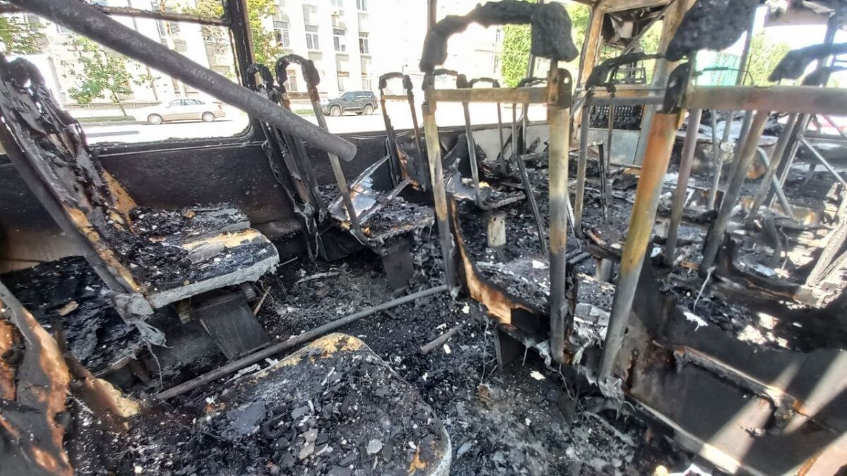 Общественный транспорт пострадал полностью - поврежден салон, видно его обугленные элементы, например сиденья; корпусу тоже досталось, но где-то все-таки сохранилась белая краска, колеса тоже выглядят целыми.