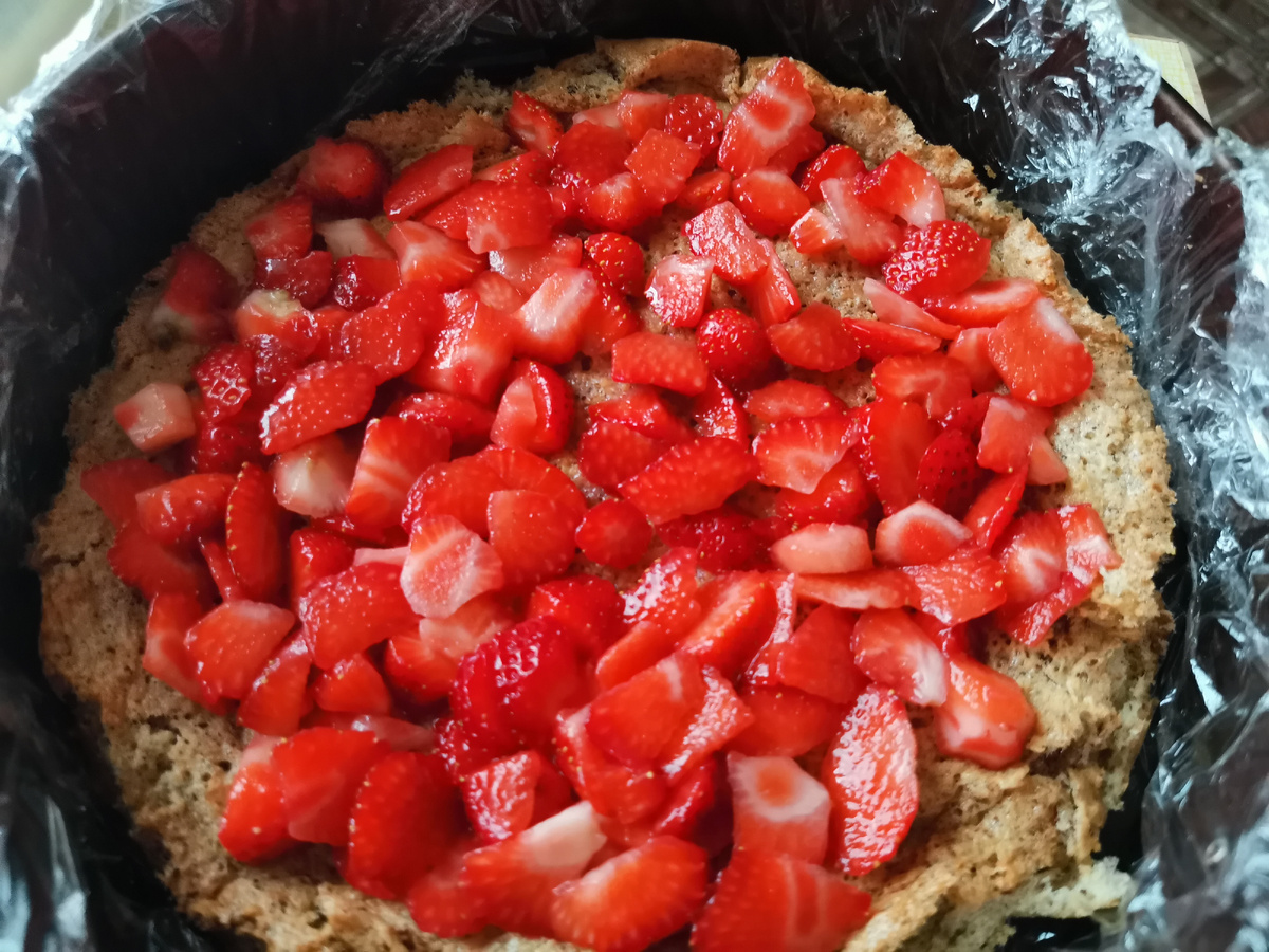 Вкусно есть хорошо, но когда это ещё и полезно, то вдвойне хорошо и вкусно😁 Сейчас время клубники, одной из самых вкусных ягод и приготовить из неё нежный торт или десерт сама природа подсказывает! Яйца 3 шт(180г) Сахар 50 г Орехи(миндаль, фундук) 50 г Соль 1/4 чайной ложки Клубника 300г(по желанию можно больше)) Творог 200г(жирность подбирает на ваш вкус, у меня обезжиренный) Сахар 50г Соль 1/4 чайной ложки Желатин 20г Вода 150г Ванилин по вкусу и по желанию Сначала замочить желатин 20г в воде 150г, пусть стоит набухает, а мы идём печь корж. Корж у нас будет без муки и без крахмала, нам нужны будут только орехи(миндаль или фундук), 50 грамм. В блендере измельчить орехи до состояния мелкой крошки, если нет блендера, то можно прокрутить в мясорубке с мелкой сеточкой. Взбиваем миксером 3 яйца (0 сорт), постепенно добавляя соль и сахар, до пышной пены(увеличится в 3 раза). Затем убавляем скорость до самой низкой(или берём лопатку или ложку), добавляем измельченые орехи,