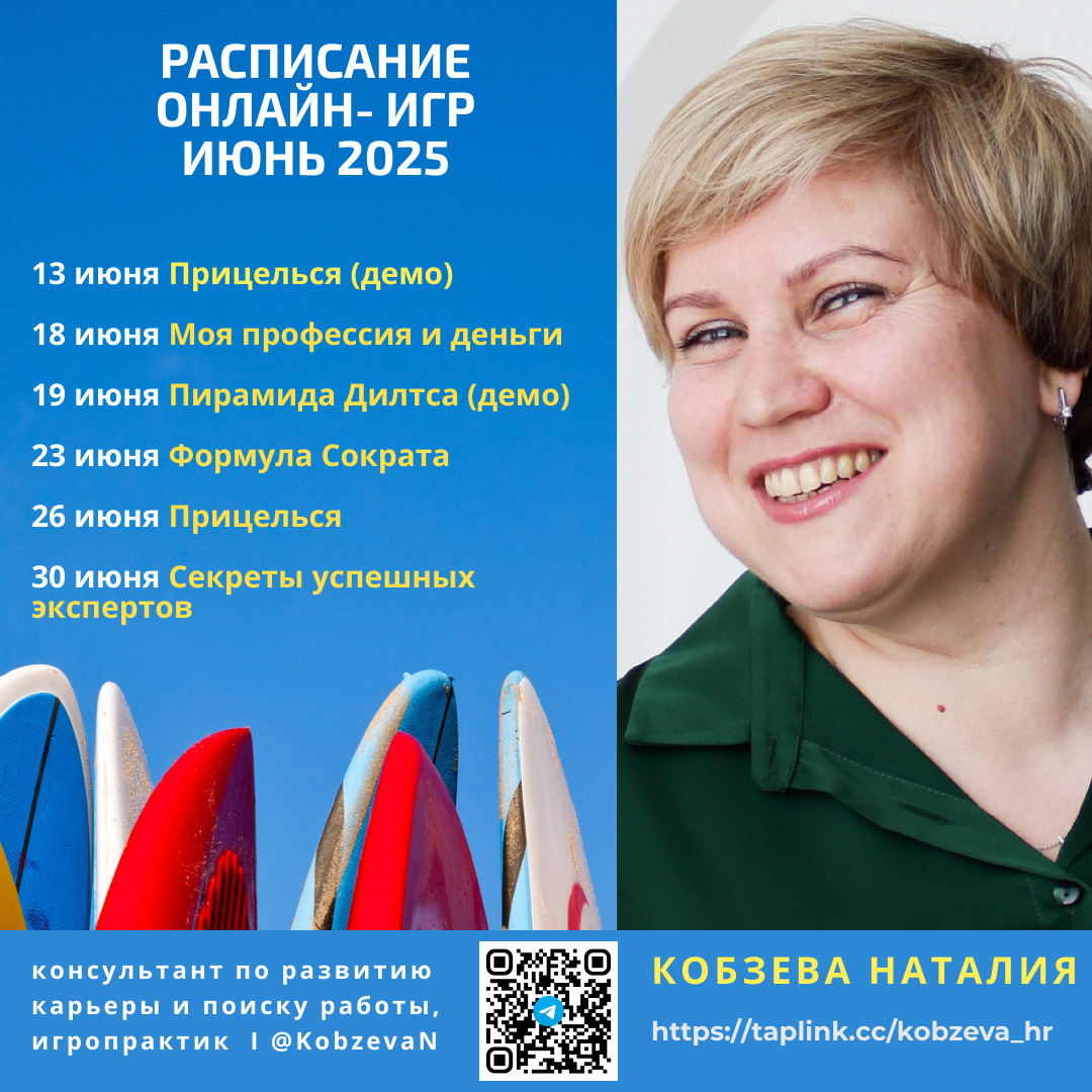 Друзья, ловите расписание моих групповых онлайн-игр на июнь 2025 года. 13 июня 2025 - 12.00-13.30 ДЕМОНСТАЦИОННАЯ ВЕРСИЯ игры ПРИЦЕЛЬСЯ. Приходите познакомиться с игрой и задавайте ваши вопросы https://t.me/careergame_mpd_kobzeva_hr/123/155