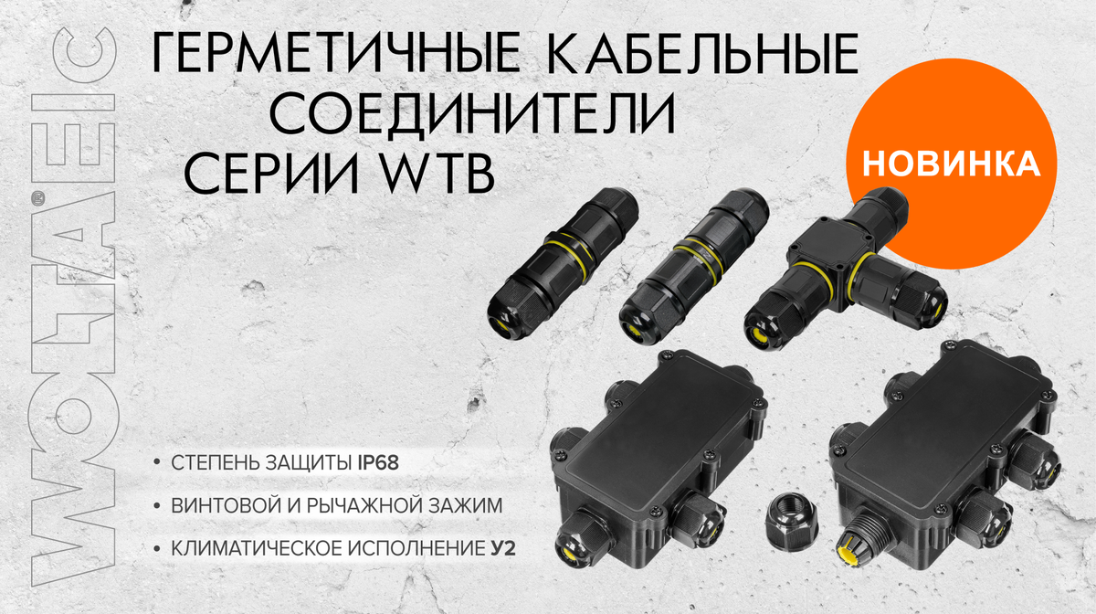 Новинки от WOLTA®Pro – герметичные кабельные соединители серии WTB и клеммы монтажные соединительные серии KSP. WTB предназначены для подключения и распределения электрических проводников. Благодаря степени защиты от пыли и влаги IP68 и климатическому исполнению У2, соединители могут использоваться при неблагоприятных погодных условиях. Материал корпуса – полиамид или поликарбонат. Модели работают при помощи винтового или рычажного зажима. KSP предназначены для присоединения и ответвления одно- или многожильных проводников в электрических сетях. Материал корпуса – полипропилен и поликарбонат. Все модели работают при помощи нажимного зажима.