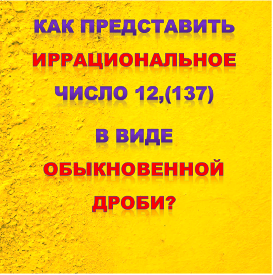 Однако, если количество знаков после бесконечное, но они повторяются с определенной периодичностью, то такую дробь мы отнесем к рациональным числам.Например, 1,377777… = 1,3(7) – «одна целая, три десятых и семь в периоде». Решение этого задания представлено в учебниках в виде относительно несложного процесса, который можно представить в виде алгоритма: 1. Обозначаем данную периодическую дробь как «х»: 0,(15) = х. 2. Умножаем «х» на 100: 100х = 15,(15) (при умножении на 100 запятая сдвигается на такое количество знаков вправо, сколько нулей у сотни, а поскольку дробь «имеет бесконечный хвост» из чисел «15», то после запятой в числе 15,(15) остается тот же «бесконечный хвост»). 3.Умножеаем х на 10000: 10000х=1515,(15) 4. Вычитаем: 10000х-100х = 1515,(15) – 15,(15). Получаем уравнение 9900х=1500, х = 1500/9900 х = 5/33. Вроде бы, все просто, но, встретившись с дробью типа 12,(137) и умножив ее, по алгоритму, на 100, а затем на 10000 мы, увы, не поучим желаемого результата: 100х = 1213, (