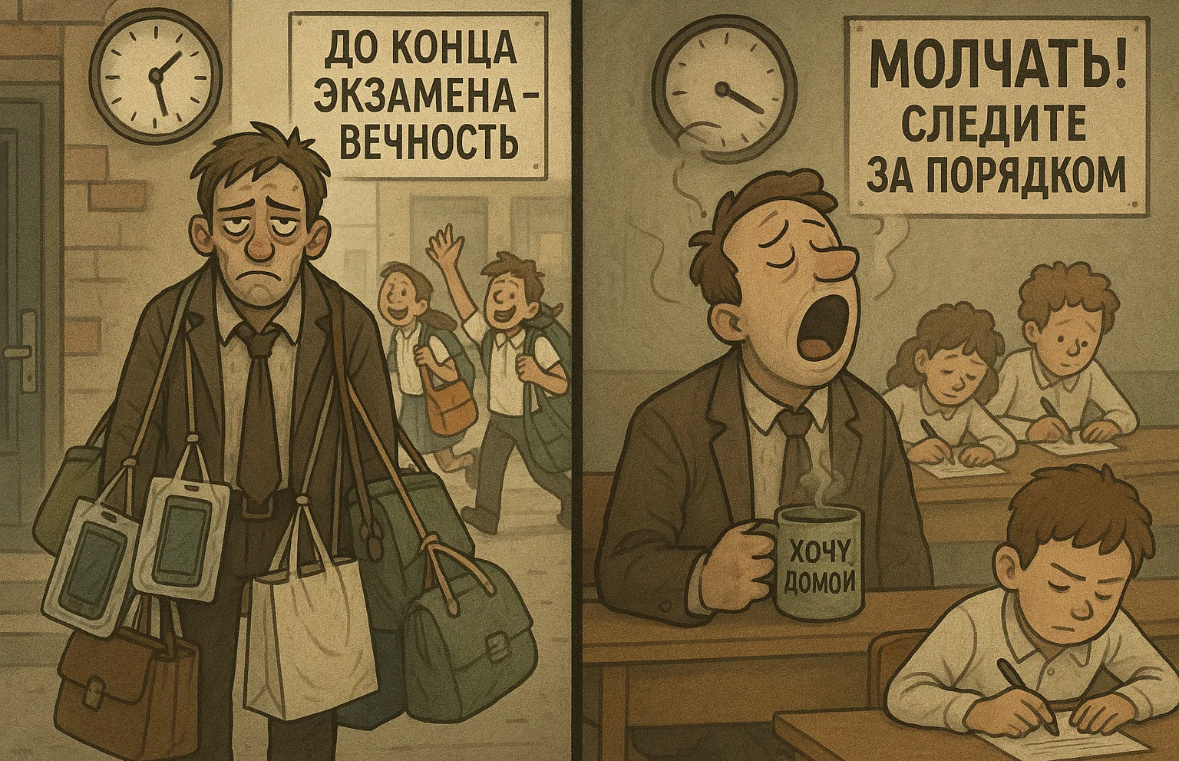 ОГЭ — испытание не только для школьников, но и для учителей. Каждый год нас распределяют по разным "ролям", и лично у меня есть две, которые я каждый раз встречаю без особого энтузиазма. Мягко говоря. Быть классным руководителем в день экзамена — это не столько про поддержку учеников, сколько про участие в квесте "стань вешалкой и хранилищем". Заранее просишь: — Ребята, пожалуйста, не берите сумки. Оставьте телефоны дома. Минимум вещей! В ответ — дружный коллективный игнор. В день Х они появляются с рюкзаками, пакетами, мешками, иногда с ощущением, что собрались не на экзамен, а в туристический поход. А ты стоишь с этими авоськами, как новогодняя ёлка, усыпанная чужими гаджетами и грузами. И ждёшь. Пока их запускают в ППЭ, ты остаёшься сторожить "клад". Хорошо хоть, потом можно посидеть с коллегами в комнате ожидания. Поболтать, выдохнуть. Эта часть уже терпимая. Но есть и роль пострашнее — организатор в аудитории. Во-первых, это ответственность. Малейшее нарушение — и ты уже не прос