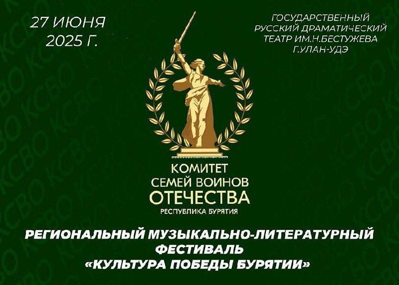 В Улан-Удэ пройдёт первый творческий фестиваль для участников специальной военной операции, членов их семей и волонтеров Организатор: Комитет семей воинов Отечества Республики Бурятия Первый региональный музыкально-литературный фестиваль «Культура Победы Бурятии» объединит настоящих патриотов и станет отправной точкой в раскрытии истинных талантов участников СВО. На фестивале зазвучат голоса и тех, кто своими молитвами и любовью поддерживает бойцов в самые трудные периоды службы. 27 июня в 14:00 в Русском драматическом театре им Н.А. Бестужева состоится открытие фестиваля. Присутствующих ждут, мастер классы, выставка, презентация журнала, юридические консультации и многое другое. Гала-концерт в 18:00. Вход свободный. 0+