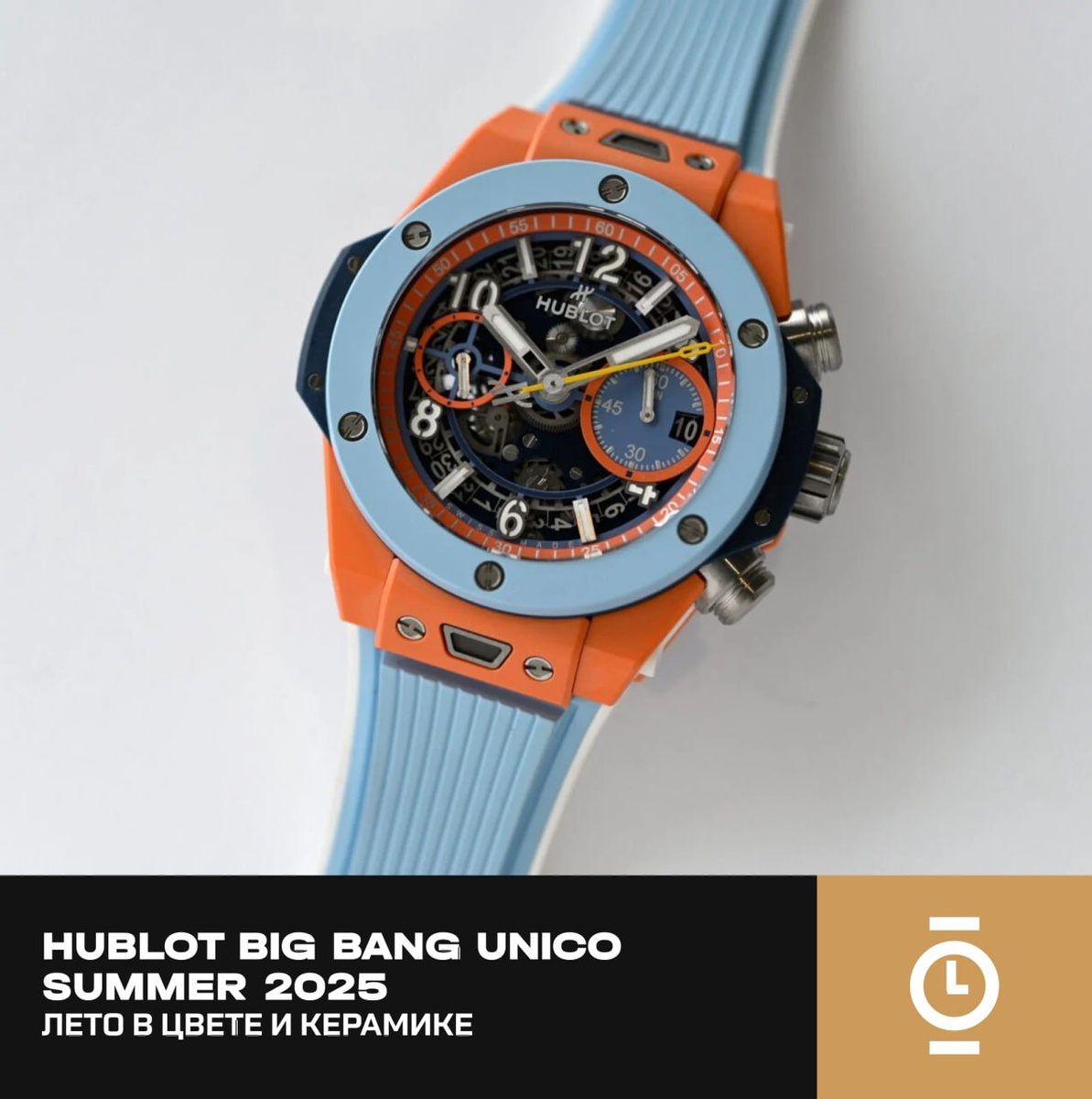 HUBLOT BIG BANG UNICO SUMMER 2025: ЛЕТО В ЦВЕТЕ И КЕРАМИКЕ #новость_WD Hublot встречает лето 2025 новой лимитированной моделью Big Bang Unico Summer, выпущенной тиражом 100 экземпляров. Вдохновлённая атмосферой побережья и историческими гоночными цветами Gulf Oil, новинка сочетает ярко-оранжевый, небесно-голубой и тёмно-синий оттенки. Корпус диаметром 42 мм выполнен из оранжевой микропескоструйной керамики, безель — из голубой. Скелетонизированный циферблат оформлен в тёмно-синих тонах с акцентами в жёлтом и оранжевом, включая счётчики и стрелки с Super-LumiNova. С обеих сторон установлены сапфировые стёкла, водонепроницаемость — 100 метров. Модель оснащена автоматическим хронографом HUB1280 Unico с функцией flyback и колонным колесом. Калибр состоит из 354 деталей, работает с частотой 4 Гц и имеет запас хода 72 часа. Кремниевый спуск улучшает точность и устойчивость. В комплекте — три каучуковых ремешка с системой быстрой замены One-Click. Цена: CHF 28 500 / EUR 32 600 / USD 31 3