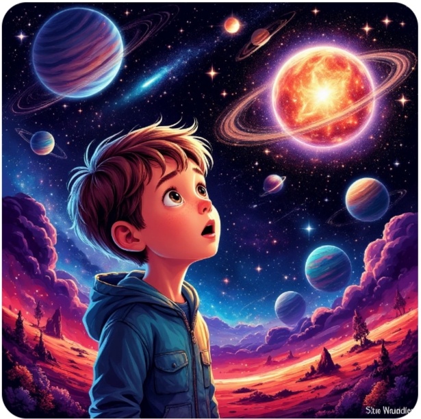 В далёкой деревне у подножия высоких гор жил мальчик по имени Никита. Он каждую ночь смотрел на звёзды и мечтал отправиться в путешествие по космосу, чтобы увидеть далекие планеты и тайны Вселенной. Однажды ночью, когда небо было особенно ясным, к нему подошёл странный светящийся шар и заговорил: — Никита, ты избранный стать Звёздным странником. Приготовься к путешествию! Сердце мальчика забилось чаще. Шар поднял его в ночное небо, и Никита увидел бескрайние просторы галактик, планеты с кристаллами и моря из света. Он встретил звездных существ, которые рассказали о важности мечты и смелости идти за ней. После долгого путешествия шар вернул Никиту домой, подарив ему звезду на память. С тех пор Никита знал — мир гораздо шире, чем кажется, и мечты могут стать реальностью, если верить в них.