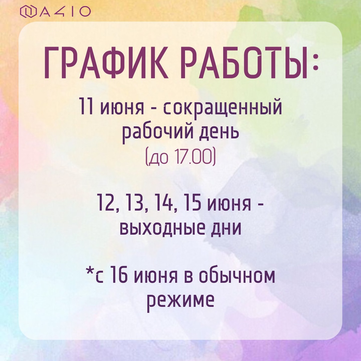 🌸Коллеги!🌸 Информируем вас о режиме работы в праздничные дни: ☀️11 июня - сокращенный рабочий день (до 17:00) ☀️12, 13, 14, 15 июня - выходные дни *с 16 июня в обычном режиме