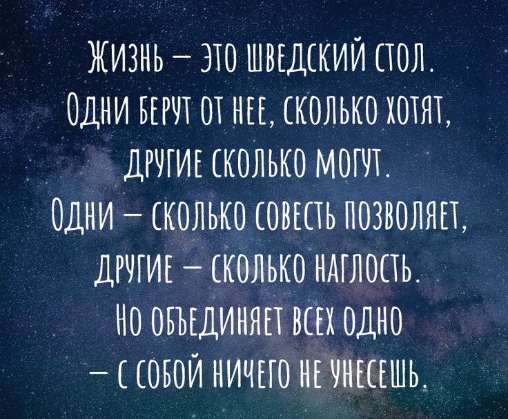 Про жизнь.. 🙂 Жизнь нас всех (и каждого в отдельности ) поимела и поимеет, возможно, и не раз. И каждый понимает, о чем речь. И это происходит в любом возрасте. Правда, говорят, что есть люди, жизнь которых происходит ровно, гладко, все у них по плану. Никаких неожиданностей не происходит. Никаких сбоев. Родились в нужной правильной семье, хорошие гены. Воспитываются любящим родителями. И вообще кругом и везде- одна сплошная любовь. И так живут они долго и счастливо. Успешны, в здравии, богаты, счастливы. Сразу родились с лучшей версией себя и такими остаются всю земную жизнь. Супер! Таких не знаю лично. Развитие, осознание всегда происходит через потери, страдания и всякие такие катаклизмы, когда мозги переворачиваются на 180 градусов- так считают человековеды. Если ничего этого не происходит, значит осознания, тем более просветления не произойдёт. Так и останешься тёмным, непросвещенным , в дикой пещере своего понимания жизни. Кто-то, возможно, скажет: хорошо же! Это и