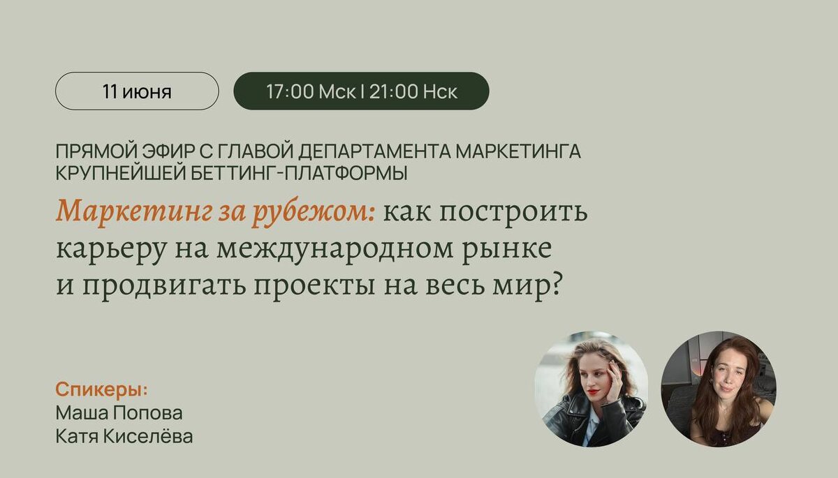 Прямой эфир с главой маркетинга беттинг-платформы, которую вы все знаете 🤯 Как продвигать проекты на мировой уровень и строить карьеру за рубежом? Как работает маркетинг крупных международных компаний? Чтобы это обсудить — позвала на эфир маркетолога нереального масштаба👇🏼 Маша Георг — твёрдый эксперт, который топит за цифры, а уже потом за креатив: • Head of Marketing в одной из крупнейших беттинг-платформ • Увеличила вовлечённость соцсетей проекта в 11 раз, открываемость писем — в 17 раз! 📌Встречаемся 11 июня 17:00 мск О чём поговорим: — Как строить карьеру за рубежом — Как находить проекты с хорошими зарплатами и реальным шансом непрерывно расти — Чем отличается маркетинг в России и за рубежом Всем, кто хочет зарабатывать в долларах и евро, строить бизнес в Европе, Азии и не только, работать с международными компаниями — обязательно быть! Маша — ещё и спикер моего курса MarkSet. Студенты, не представляете, что вас ждёт 😃❤️ Придёте на эфир? Ставьте реакцию и пишите в ко