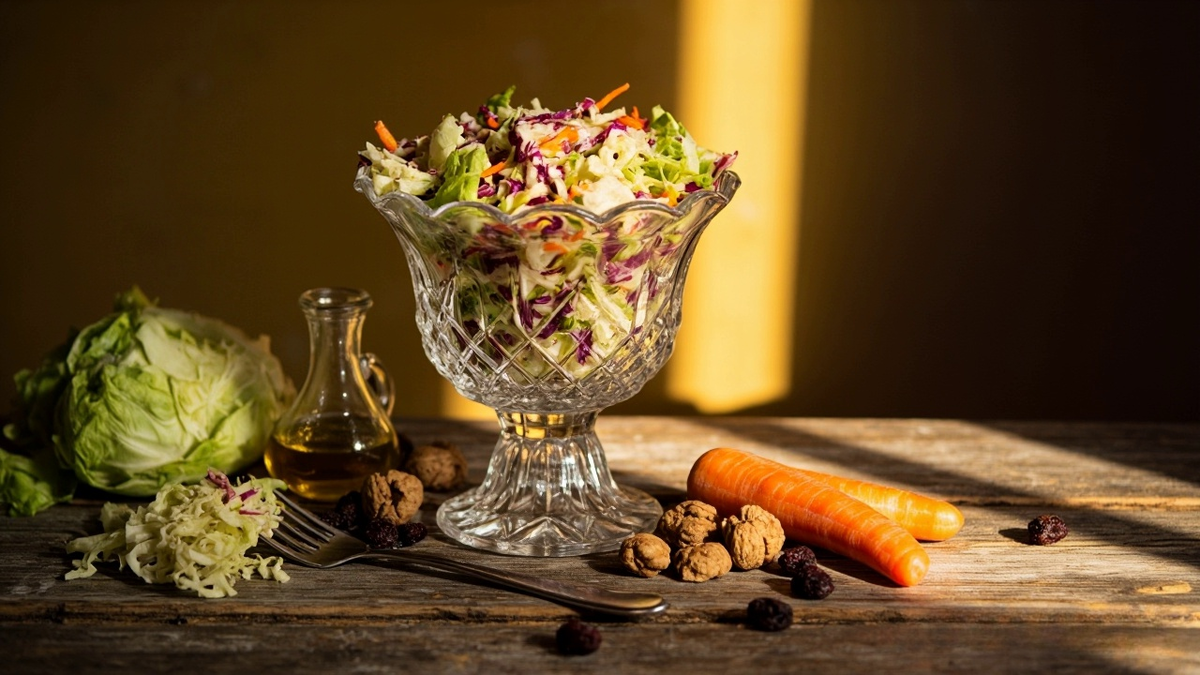 3. Смешайте салат: В большой миске соедините капусту, яблоки, орехи и изюм.