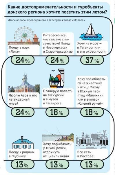 📊А вот и итоги опроса, посвященного вашим, дорогие читатели, любимым местам отдыха в Ростовской области 🧳Итак, с большим отрывом лидирует красавец-Таганрог. Также многие из вас отдают предпочтение Новочеркасску, Азову, парку «Лога» и Старочеркасску. 📍Напомним, в донской станице Старочеркасской открылся дом-музей советского писателя, очеркиста Владимира Фоменко. Среди его произведений наибольшую известность получил роман «Память земли», в основе сюжета — строительство Цимлянского водохранилища и вынужденное затопление хутора, находящегося на дне будущего моря. Курень писателя восстановили на старом фундаменте, сохранив изначальные размеры и внешний облик. При выборе цвета фасада остановились на оттенке яркой охры, которая была здешним казакам по душе. Обустроили и подворье с видом на Воскресенский войсковой собор: тут можно увидеть летнюю кухню с погребом и даже уличную печь-горнушку, которой казаки пользовались в теплое время года. 📝Автор: Виктория Головко. Инфографика: Екатери