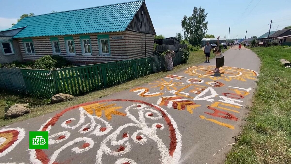 Сколько этому обычаю лет, точно в селе не знают, говорят, несколько веков из поколения в поколение передают традицию предков и в православный праздник Святой Троицы все дворы выстилают коврами-оберегами из песка. У деда Анатолия есть свой рекорд по изготовлению песочной мозаики — 10 часов. Пенсионер трудился всю ночь, чтобы порадовать семью и односельчан. В этом году его дети и внучка Александра решили сделать самое большое солнце в селе. Для гигантской работы заготовили 12 мешков цветного песка.