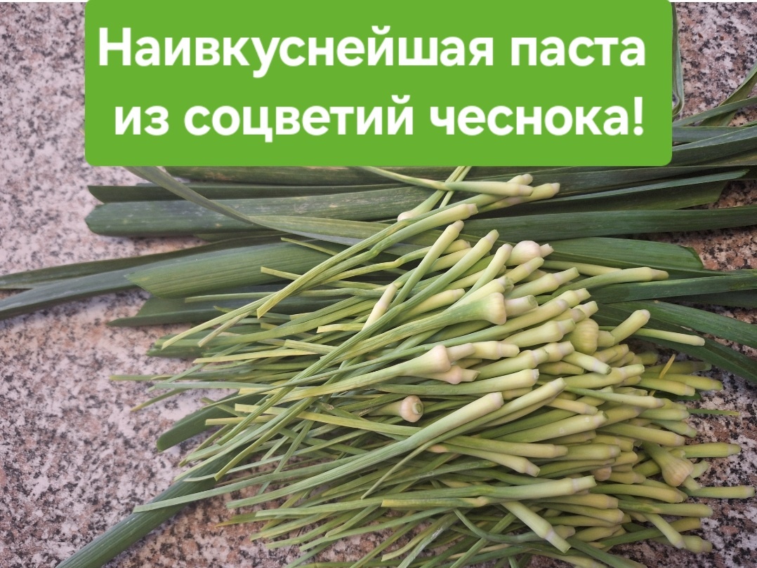 Если Вы выращиваете чеснок, то, как и многие, готовите стрелки чеснока! Рецептов множество! Но! Но все отрезают и, почему-то, выкидывают соцветия чеснока, т.е. верхнюю часть стрелки. А они СЪЕДОБНЫЕ и очень даже вкусные! И могут быть использованы в любом рецепте, где требуется чеснок! И готовить их можно по тем же рецептам, что и, так называемые, стрелки! И я сейчас, вместе с Вами, приготовлю ПАСТУ ИЗ СОЦВЕТИЙ ЧЕСНОКА. У нас она еще называется ЧЕСНОЧНЫЙ ПАШТЕТ. Вкусная, ароматная, яркая и в меру острая, чесночная паста подойдёт ко многим блюдам. А к борщу, да на кусочке черного хлебушка- ой, как вкусно! Рецепт простой: Стрелки мою под хололной водой Отрезаю верхнюю часть стрелки там, где формируются так называемые бульбочки - это и есть соцветия чеснока Обстригаю подсохшие кончики Если у Вас мало стрелок, как у меня в этот раз, то можно добавить молодые зеленые листья чеснока Далее я всегда добавляю грецкий орех - это изюминка этого рецепта! Для этого я предварительно орех заливаю