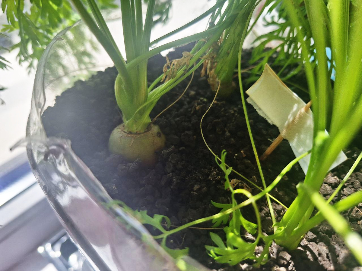 Приветствую вас на моем втором канале. Решил попробовать достать одну из 4-х посаженных в 5-литровую бутылку морковок. Земля была набрана на улице. Солнышко бесплатное, ставропольское. Вода из под крана, отстоянная, питьевая. Деньги заплачены только за семена. Но это сущие копейки. Пока из всего пакета семян использовано только 5 штук. Одно не взошло, перепосадил. Эта морковка в нижем правом углу фото. А достать я решил ту морковку, которая почти в центре фото. У нее самая большая и оранжевая попка, в отличии от других. Выглядит вполне себе зрелой. Достал ее. Но она оказалась короткой, но при этом пухленькой 🤣 Вес морковки оказался всего 33 грамма. Ну может на грамм меньше из-за остатков ботвы. Не знаю, вовремя ли я ее выдернул. Может стоило еще немного подержать. Но на вид и на запах вполне себе съедобная морковка. На вкус пока не пробовал. Хочу дождаться остальных. Пока положил в холодильник. Не знаю еще как ее лучше съесть, так как есть, свежей, или отдать жене на супы и другие бл