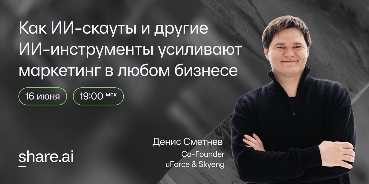 🎯 Как ИИ-скауты и другие ИИ-инструменты усиливают маркетинг в любом бизнесе Открытая онлайн-встреча от бизнес-клуба Share.AI в рамках серии мероприятий ИИнсайт. Что будет на вебинаре: •AI-скауты для работы с блогерами •Повышение LTV и конверсий с помощью ИИ-инструментов •Оптимизация рекламных кампаний с AI 📅 Дата: 16 июня ⏰ Время: 19:00 🌐 Формат: вебинар Регестрируйтесь на вебинар, чтобы не пропустить возможность узнать что-то новое для себя и бизнеса.