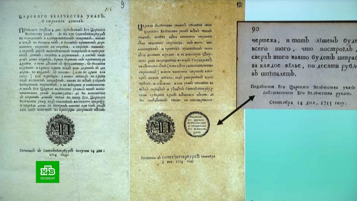 [ Смотреть видео на сайте НТВ ] То, что долгие годы считалось копией, оказалось недооцененным оригиналом. В историческом архиве сделали любопытное заявление, дополняющее картину эпохи Петра I. Указ от 14 сентября 1715 года был адресован жителям новой столицы и регламентировал строительство. Недавняя экспертиза подтвердила подлинность царской подписи на документе. Роман Киселёв, директор Центрального государственного исторического архива: «Сотрудники нашего архива в плановом порядке проводят изучение документов, выявление особо ценных уникальных документов, это часть нашей работы. И вот в процессе подготовки к выставке в руки нашего архивиста попало дело, и когда он открыл, конечно, удивились». В ходе исследования учитывались многие факторы, так как часто попадаются качественные копии. Тщательно изучался материал бумаги для выявления соответствий определенному периоду времени, проводился анализ языка и стиля написания. Особенное внимание специалисты уделили изучению автографа государя.