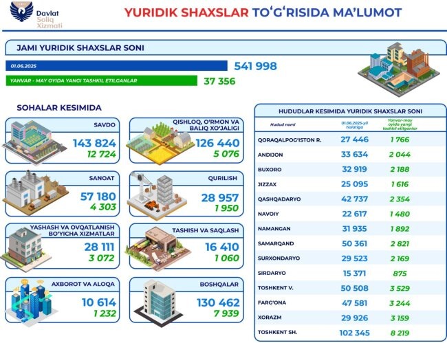 По состоянию на 1 июня 2025 года в Узбекистане насчитывается 541 998 действующих юридических лиц. Отмечается, что 37 356 юридических лиц из них были вновь созданы за первые пять месяцев 2025 года.