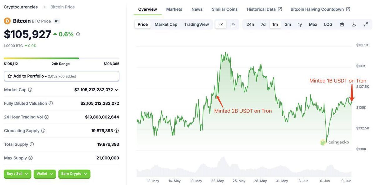 💵Tether снова выпустил 1 миллиард USDT Всего через три недели после предыдущего выпуска Tether напечатал очередной миллиард стейблкоина на блокчейне Tron. 💸Что это значит? Когда Tether выпускает новые USDT, это обычно означает, что крупные игроки (киты, институциональные инвесторы или фонды) внесли доллары в резервы компании в обмен на криптодоллары. Такая эмиссия часто служит сигналом к росту рынка — новые USDT могут пойти на закупку биткоина и других активов. Пример из недавнего прошлого: 21 мая Tether напечатал 2 млрд USDT, и уже на следующий день Bitcoin обновил исторический максимум, превысив $111 000. Сейчас ситуация может повториться — следим за рынком! 👀
