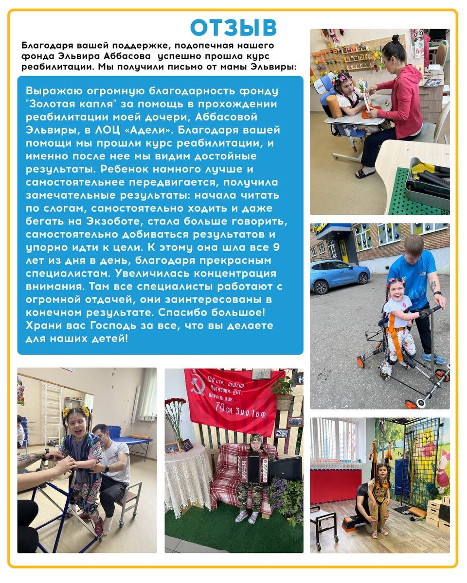 🎉 Благодаря вашей отзывчивости Эльвира Аббасова прошла курс реабилитации. Мы искренне благодарны за вашу поддержку и участие! Сегодня Эльвира заметно продвинулась вперед, и в этом есть огромная доля вашей помощи.