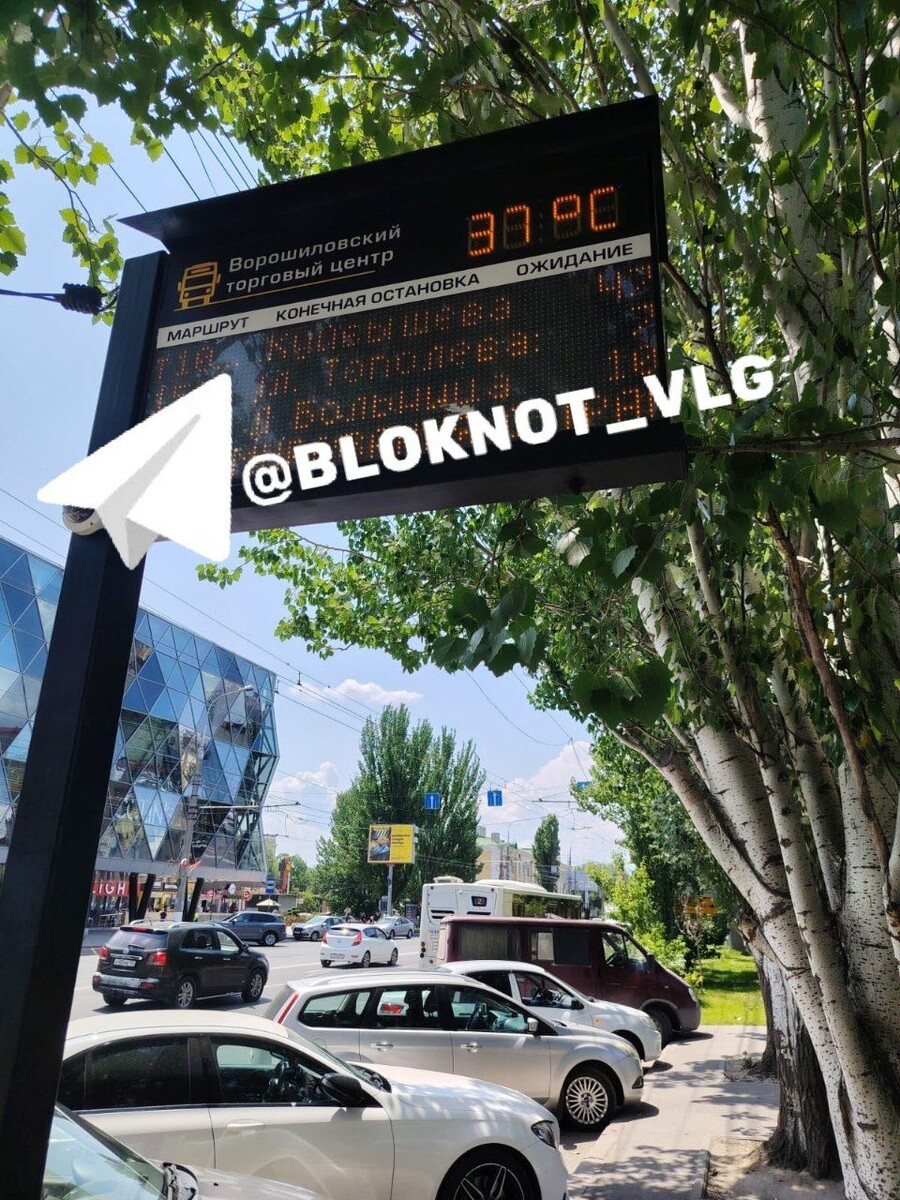 Экстра-отметки были замечены в полдень, в самый разгар пиковой жары в Волгограде, когда специалисты не рекомендуют появляться на улице. Так, табло на остановке «Ворошиловский торговый центр» продемонстрировало ожидающим транспорт людям температуру под +40 — +37 градусов. И это при том, что устройство частично находится в тени дерева. Несмотря на то, что прибор раскалился до предельной температуры, на которой можно пожарить яйцо, он не перестал показывать волгоградцам прибывающий транспорт и время его ожидания. Еще держится и не отключается. Настоящую шокирующую отметку этого сезона продемонстрировало табло на остановке «Современник». Это табло на солнце раскалилось до +70 градусов. Неудивительно, что устройству «поплохело», оно потеряло сигнал и показывает ситуацию в виде небольших тире. Расписание прибытия на фоне адской жары в миллионнике временно исчезло из поля зрения ожидающих автобусы и троллейбусы. Ранее синоптики предупреждали, что в этот понедельник воздух в отдаленных районах