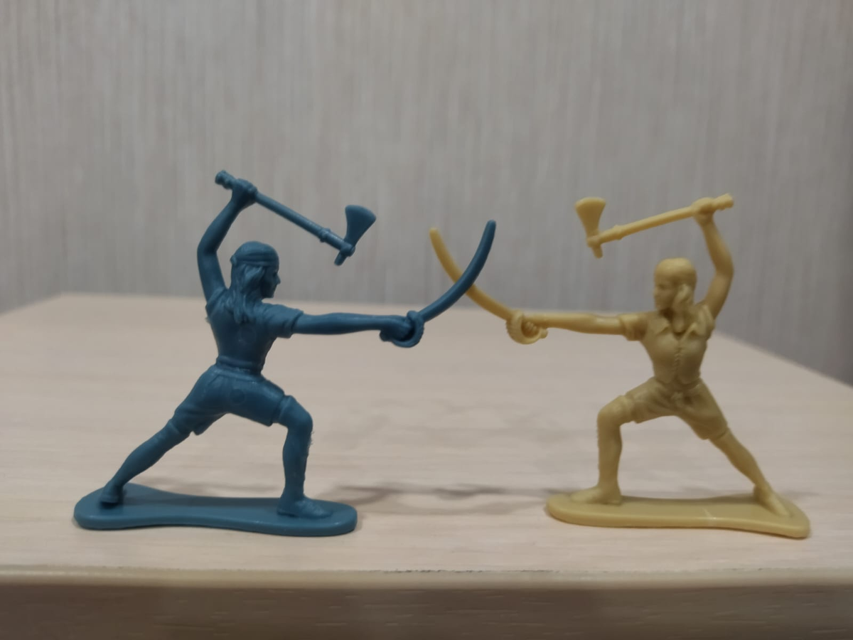 Ave любители солдатиков! Продолжаем нашу постоянную рубрику, в которой читатели демонстрируют что же интересного попало в их коллекции. Сергей Тарасов показал, что же прислали ему из Китая. Забрал в пункте доставки купленный в Китае набор Пиратов. На сайте он имеет название "Фигурки пиратских воинов". В наборе 20 фигурок. 10 пиратов и 10 пиратов-скелетов. Плюс всевозможные аксессуары для игры. Материал пластик. Высота фигурок 5 см. Упаковка. Пластиковый пакет (довольно плотный), прошитый скрепками и прикрепленной ими же чем то вроде картонной крышки. Аксессуары представляют из себя два сундука с сокровищами, две рогатины, два бочонка, два костра (как это понял) и что то вроде ограды. Фигурки и пиратов и скелетов представлены в 5 позах, по две фигурки в каждой позе, но в разном цвете. Как я понимаю представитель абордажной команды. Пират с кошкой. Пират с бомбой и пистолем. Стрелок Ну это видимо Капитан. Куда же без крюка-протеза и попугая на плече.13:54 Первый из скелетов. В одной рук