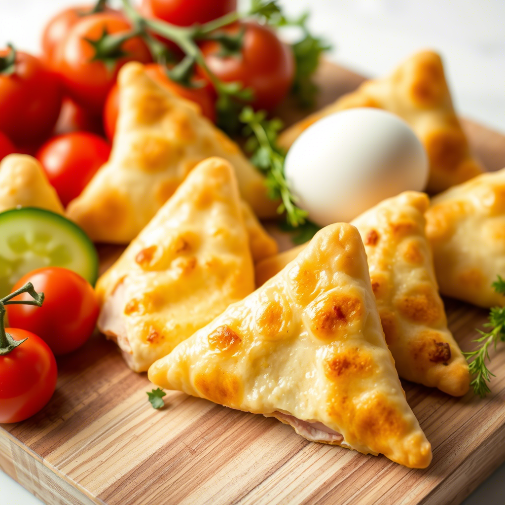 Треугольники из лаваша с ветчиной и сыром Ингредиенты (на 4 штуки): - Лаваш армянский (тонкий) — 1 большой лист (или 2 средних) - Ветчина — 4–6 тонких ломтиков - Твёрдый сыр — 50–70 г (например, чеддер, маасдам или гауда) - Яйцо — 1 шт. (для смазывания краёв) - Молоко или сливки — 1 ст. ложка (можно добавить в яйцо) - Соль, перец — по вкусу - Масло растительное — для выпечки (по желанию) Как готовить: 1. Подготовь начинку: - Натри сыр на мелкой тёрке. - Если хочешь, можешь добавить немного рубленой зелени (укроп, петрушка), соли и перца в сыр. 2. Разложи ингредиенты на лаваше: - Расстели лаваш на рабочей поверхности. - Равномерно распредели натёртый сыр. - Сверху выложи ломтики ветчины. - Можно добавить свежих овощей — например, помидор или огурцов, но это не обязательно. 3. Сформируй треугольники: - Разрежи лаваш на прямоугольные части (если лаваш большой). - Сверни каждый прямоугольник по диагонали, чтобы получился треугольник. Хорошо защипни края, чтобы начинка не в