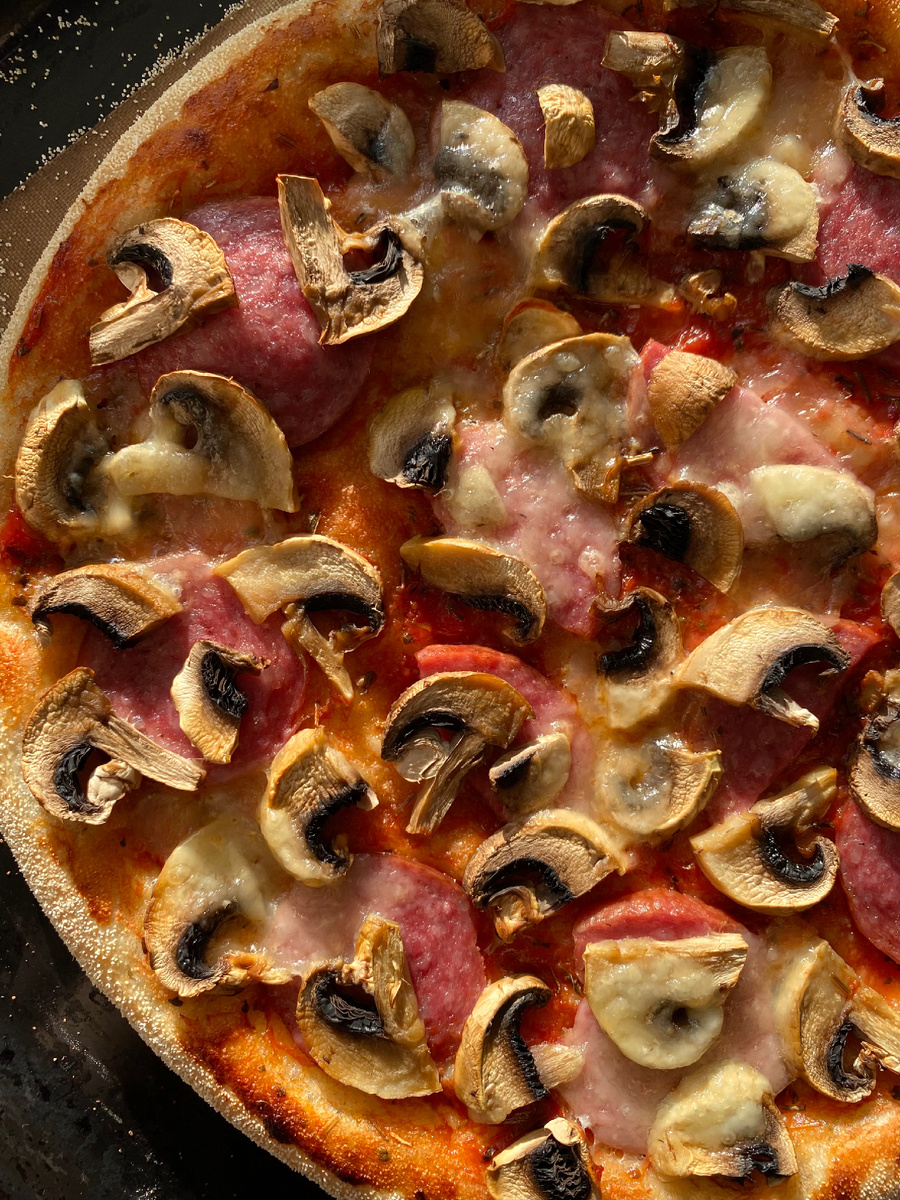 Ингредиенты: Дрожжи сухие – 4 гр или свежие 12 гр Вода тёплая – 210 гр Мука – 300 гр Соль – 5 гр Масло оливковое – 10 гр Начинка – колбаса, грибы, сыр Соус – шашлычный кетчуп + базилик 1/2 чл Приготовление: Смешиваем дрожжи с теплой водой и мукой (можно не до гладкости), оставляем на 30 минут. Добавляем соль и масло, вымешиваем тесто и даем постоять еще 10 минут под полотенцем. Разделяем его на две части, формируем шарики и оставляем отдыхать под пленкой еще на 10 минут. Затем растягиваем тесто руками на столе, присыпанном манкой, выгоняя воздух к краям. Намазываем соус, выкладываем начинку и отправляем в разогретую до 250 градусов духовку на 8 минут.