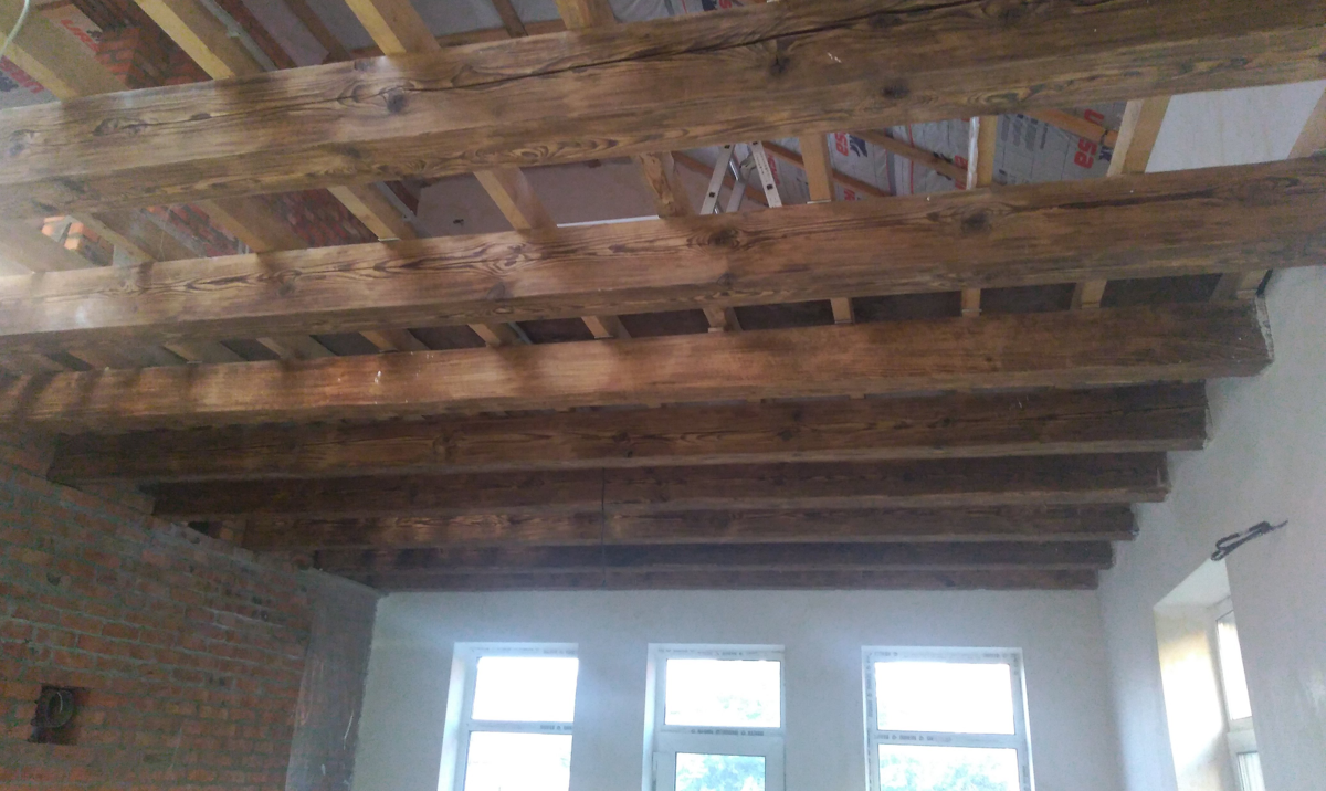 У нас не во всех помещениях скрыты балки, например в гостиной балки остались открыты и я их предварительно обжигал и зачищал.