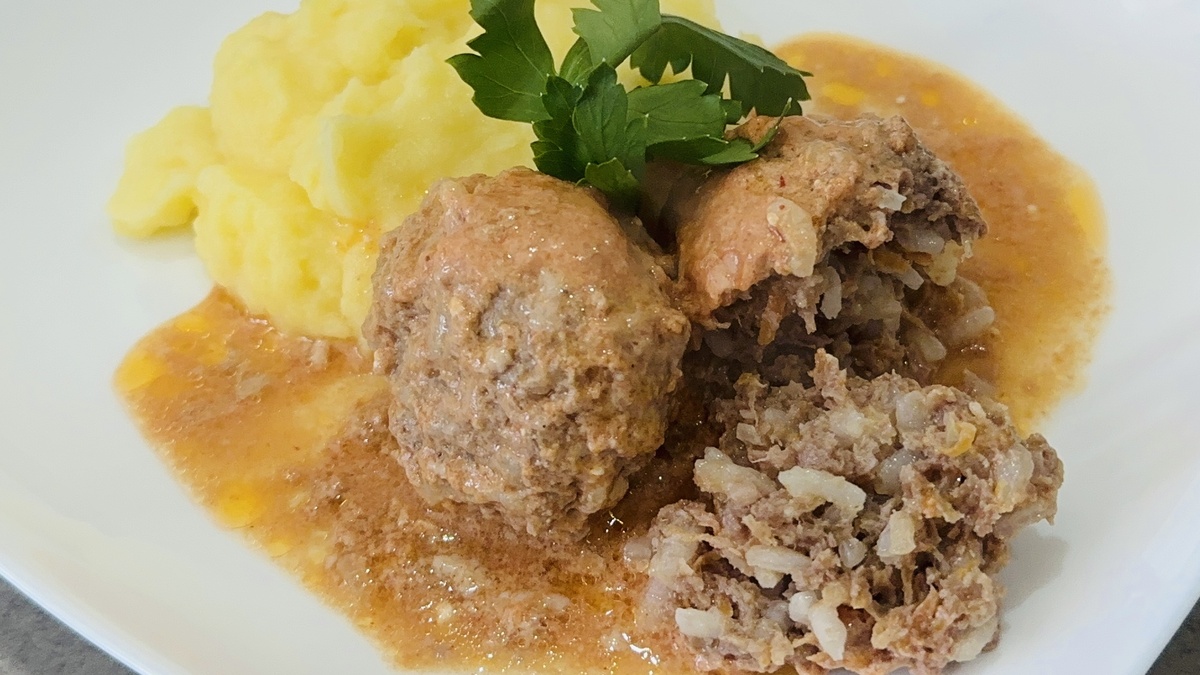 Тефтели с рисом и подливкой приготовленные по этому рецепту получаются сочными, мягкими, с легким ароматом чесночка.