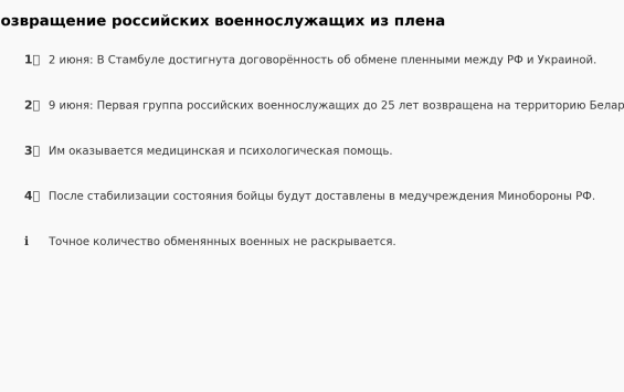Министерство обороны России сообщило о возвращении первой группы российских военнослужащих в возрасте до 25 лет с территории, контролируемой киевским режимом. Обмен прошёл в соответствии с договорённостями, достигнутыми 2 июня в Стамбуле между представителями России и Украины.