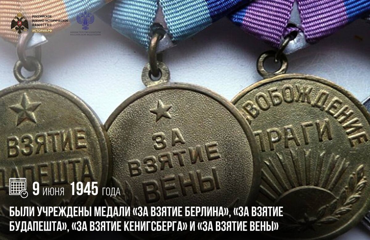 9 июня 1945 года были учреждены медали «За взятие Берлина», «За взятие Будапешта», «За взятие Кенигсберга» и «За взятие Вены»