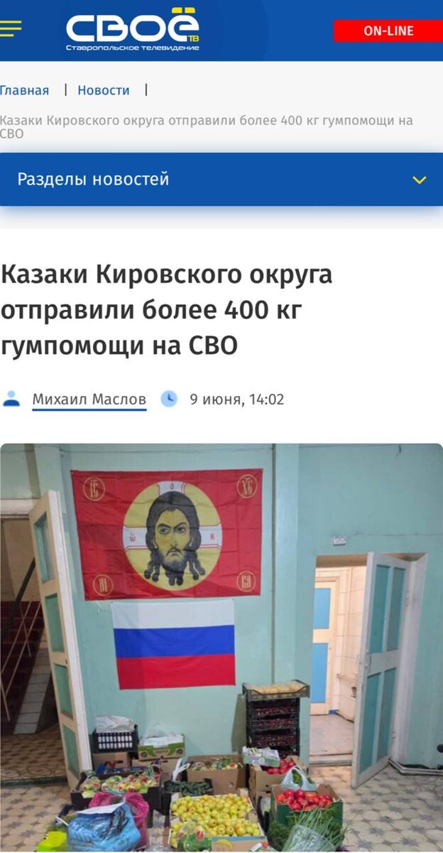 #КировскийокругвобъективекраевыхСМИ Казаки Кировского округа отправили более 400 кг гумпомощи на СВО На этот раз они направили груз в расположение бригады «Терек». Казаки новопавловского городского казачьего общества в Кировском округе доставили на фронт гуманитарную помощь. На этот раз на фронт, в расположение бригады «Терек», передали свежие фрукты, овощи и зелень, общим весом более 400 кг. Эта поездка новопавловских казаков в зону СВО стала уже 12-й с начала года. Об этом в понедельник, 9 июня, сообщили в управлении пресс-службы и информполитики губернатора и правительства Ставропольского края. «Участие казачества в спецоперации — это продолжение славных традиций предков, которые всегда стояли на защите Отечества. Сегодня казаки вновь демонстрируют свою преданность Родине», — отметил и.о. министра Ставропольского края по национальной политике и делам казачества Владислав Калхидов. Ранее губернатор Ставрополья Владимир Владимиров рассказал о поддержке образования в ЛНР.