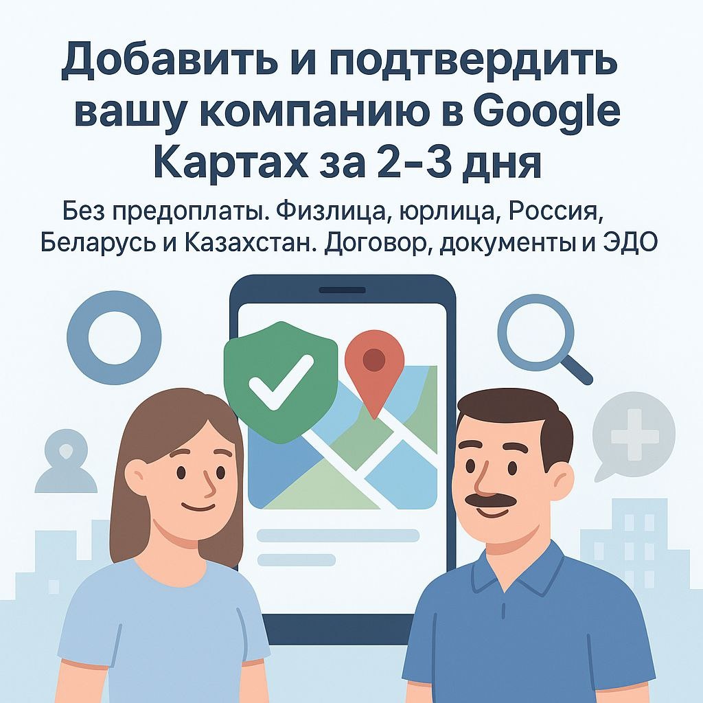 Наличие компании в Google повышает доверие клиентов и способствует росту продаж. Мы помогаем предпринимателям из России, Беларуси и Казахстана добавить компанию в Google и получить официальную верификацию Google бизнес. В результате ваша организация появится в Google Картах и поисковой выдаче, что позволит привлечь больше клиентов из Google. Наша команда также организует полную регистрацию организации Google, чтобы вы сразу воспользовались всеми преимуществами сервиса. Почему Важно Подтвердить Компанию в Google Картах и Поиске? Перед тем как перейти к инструкциям, разберемся, зачем это нужно: 1. Создайте аккаунт Google Мой Бизнес 2. Выберите Способ Верификации Google предлагает несколько вариантов подтверждения: 3. Дождитесь Подтверждения Если вы перепробовали все способы подтверждения, но это не принесло результатов, то Вы можете обратиться к нам за помощью — об этом ниже. Преимущества профессиональной верификации: почему стоит довериться специалистам ✅ Официальная Верификация в Googl