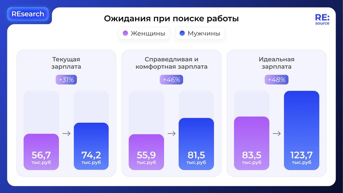 🔹🔹🔹 У мужчин как текущая зарплата, так и зарплатные ожидания на ~30-50% выше Этот гендерный разрыв исчезает на уровне магистратуры: чем выше образование у девушки, тем выше ее амбиции и тем больше заработная плата (95 тыс. рублей у женщин против 93 тыс. рублей у мужчин). Источник: ORO (рус) #REsearch Подписаться на RE:source