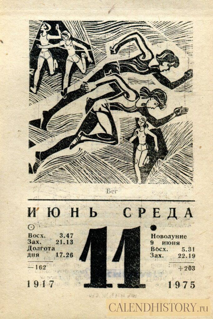 Итак, сегодня 11-го июня и у нас на календаре 1975-й год. Перед нами листок советского календаря для женщин. На календаре у нас среда - 11 июня 1975-го года. Бег *** Оборотную сторону листка этого календаря можно посмотреть у нас по ссылке на сайте. Другие листки советских календарей смотрите у нас на сайте - CALENDHISTORY.ru ПОСМОТРИТЕ ЕЩЁ ЛИСТКИ ОТРЫВНЫХ КАЛЕНДАРЕЙ: