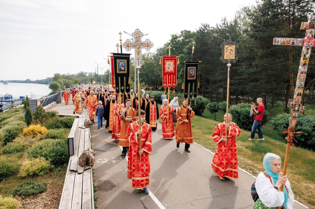 От пристани на Комсомольской набережной Крестный ход под колокольный звон и песнопения прошёл по городу до храма Рождества Иоанна Предтечи.