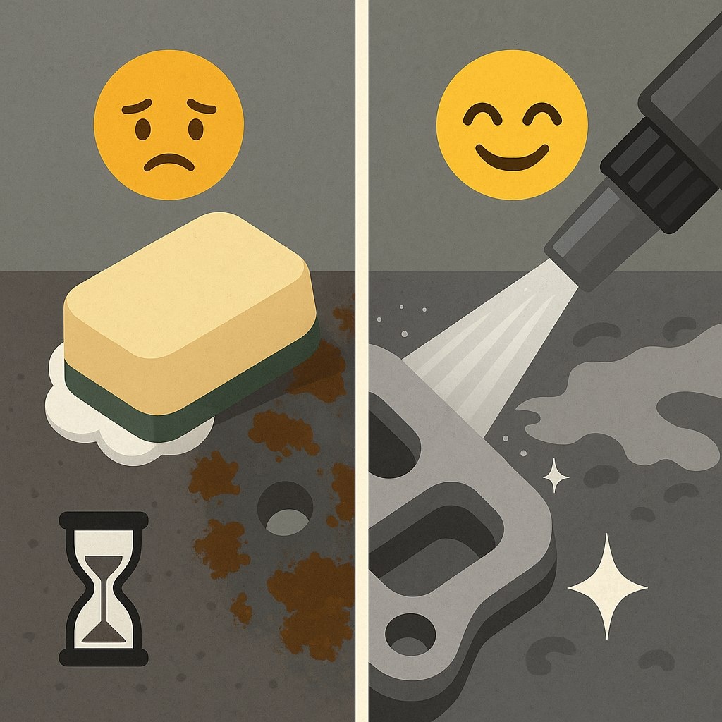 Сравнение ручной и струйной очистки: честно и по фактам 👇 🧽 Ручная очистка: – Долго ⏳ – Неравномерно 🎯 – Не достаёт в трудные места 🔧 – Требует усилий 💪 – Много расходников 🧴 💨 Струйная очистка: Быстро ⚡ Равномерно 🌀 До труднодоступных участков 🔍 Эффективно с любыми загрязнениями 💥 Экономия времени и ресурсов ⏱ 💡 Итог: ручной способ — это вчерашний день. Струйная обработка — чисто, быстро и надёжно! #пескоструй #струйнаяобработка #ручнаяочистка #дробеструй #аквабластинг #ремонт #подготовкапокраске #антикоррозия #инструменты #металлообработка