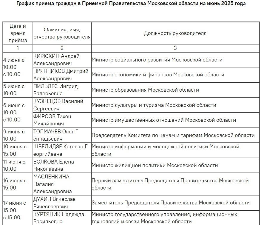 🗓 Графики приёма граждан в Приёмной Правительства Московской области на июнь 2025 года