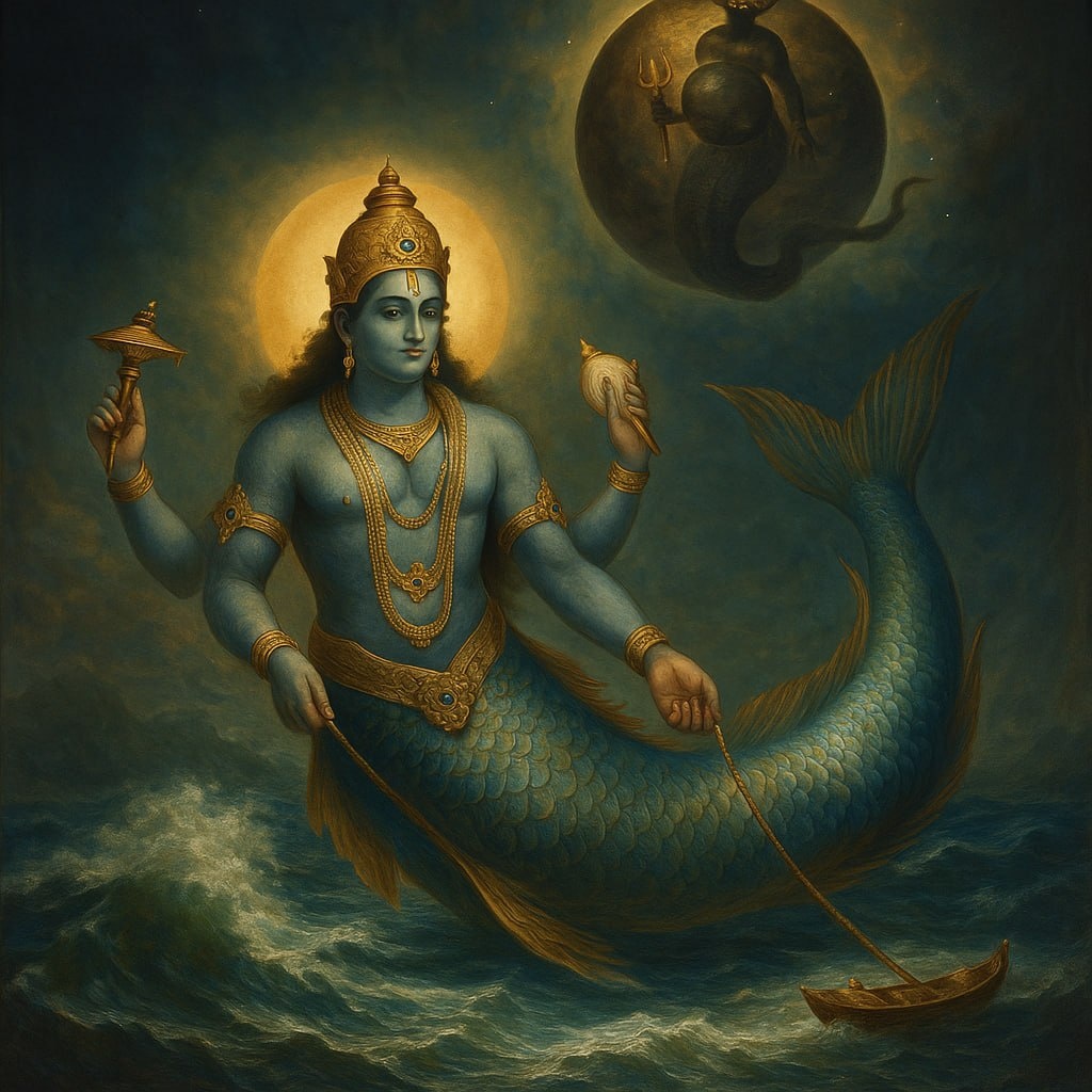 🌌 📜Согласно Шримад Бхагаватам и Матсья-пуране, в конце одной из юг, когда человечество утратило связь с дхармой и знанием, начался Великий Потоп. 🌊 Всё, что было создано — города, леса, обряды, храмы, а главное — Веды — ушло под воду. Земля погрузилась во тьму, и только немногие помнили о Боге. В этот переломный момент, в образе сияющей рыбы, Господь Вишну явился перед царём Сатьявратой, проводившим омовение в реке. Сначала — как крошечная золотая рыбка 🐠, затем — как могущественное Божественное Существо, занимающее весь океан. И Он сказал: 🕉 «Построй лодку. Возьми с собой семена жизни, мудрецов, огонь и Веды. Когда настанет потоп, Я проведу тебя». И так, во времена разрушения, среди бушующих вод, появился МАТСЯ — первая аватара Вишну 🐟. Он повязал лодку царя к своему золотому рогу и вёл её сквозь шторм, сквозь хаос, сквозь разрушение — спасая главное — Истину. 📜✨ 🌑 А кто вызвал потоп? 🌑 Это была энергия КЕТУ — теневого узла, силы отрешения и освобождения. 🔗 Он приходит