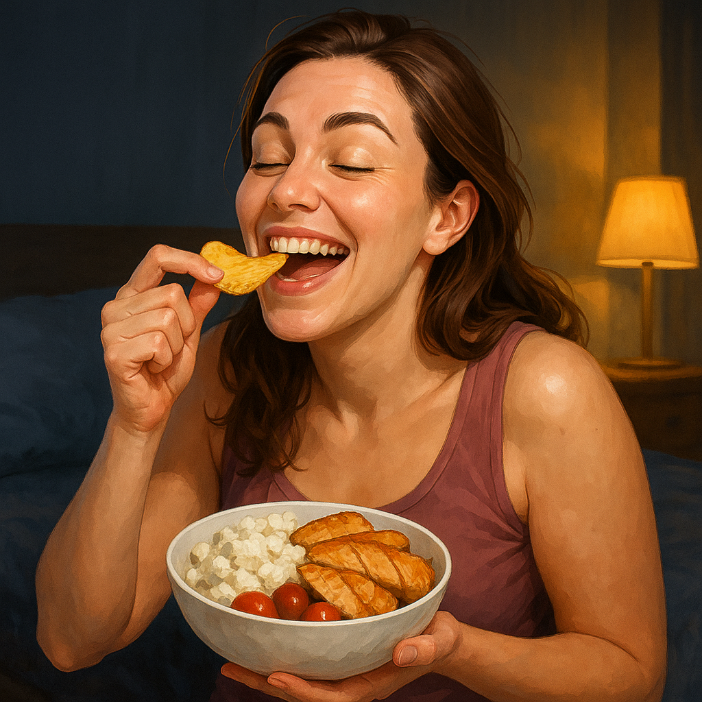 Ты, наверное, слышала эту фразу сто раз: «Никакой еды после шести!». Как будто в 18:01 организм нажимает кнопку «всё в жир». Ага, конечно. И желательно ещё с тревожным голосом бабушки из 90-х: «Ты что, на ночь?! Оно ж всё отложится!». Вот только… это не совсем так. Точнее, совсем не так. Меня зовут Галя, я фитнес-тренер, и да, я женщина, которая ест на ночь. И не только живу, но ещё и в форму влезаю. Да, есть такая теория: мол, ночью у нас должен выделяться гормон роста, он помогает восстановлению и сжиганию жира, а если ты съешь что-то сладенькое или углеводненькое (да, собственно, любое), то выскочит инсулин, который перекроет этот самый гормон. И всё – худеть не будешь. Привет, целлюлит. Теория звучит научно. Но вот беда – работает она только в книжках, а не в реальной жизни. А вот теперь – внимание. Есть не просто мнение, а метаанализ. Это когда учёные взяли и разобрали 121 исследование по теме позднего ужина, массы тела и всякой другой биохимической мишуры. Результат? Не нашли ник