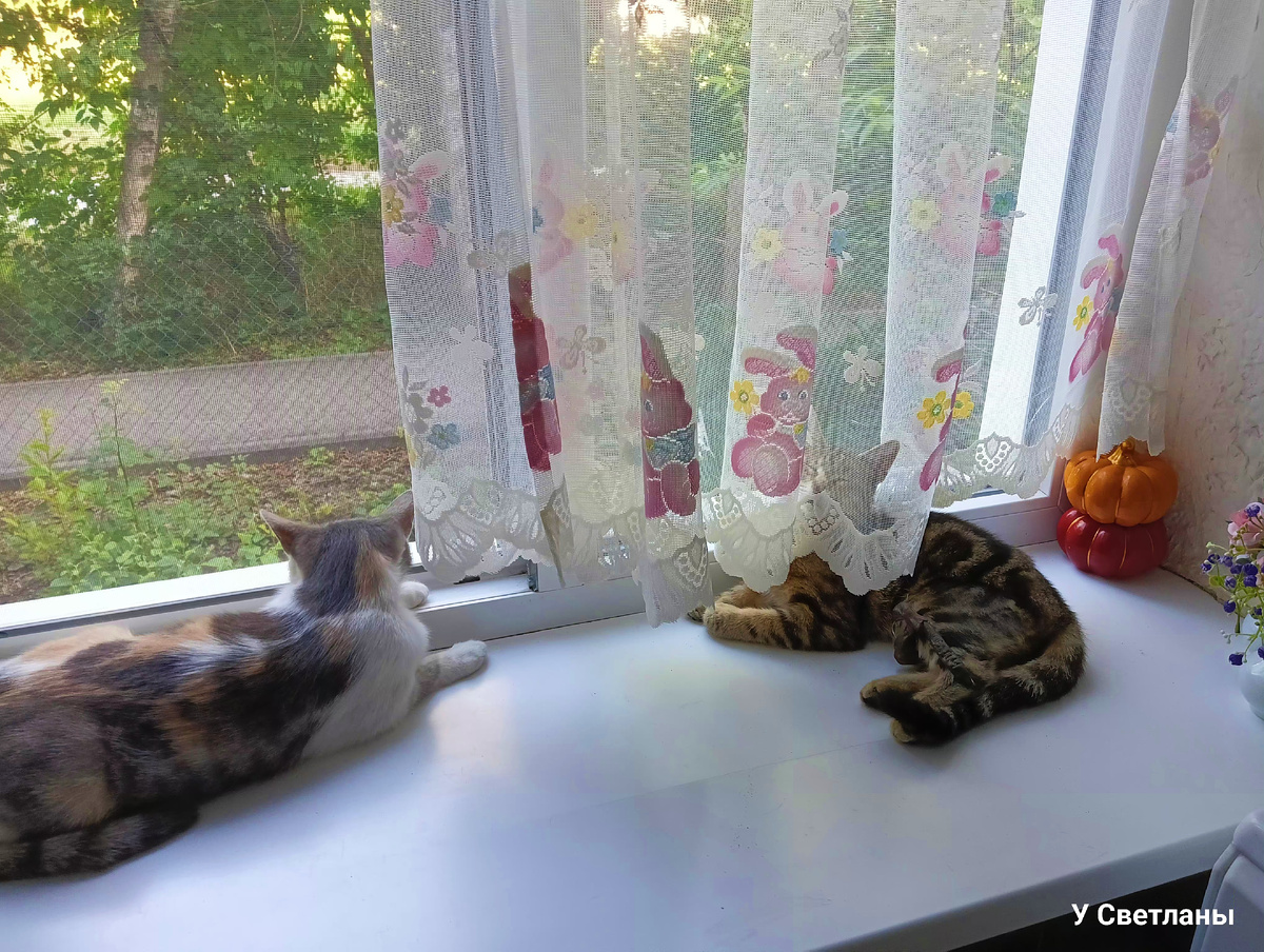 Зашла первым делом на кухню, а там Машутка с Васи́лем. Я не разрешаю другим, кроме Василька, лежать на подоконнике, но, видимо, они умудрились открыть дверь, так как на ночь мы её закрывали.