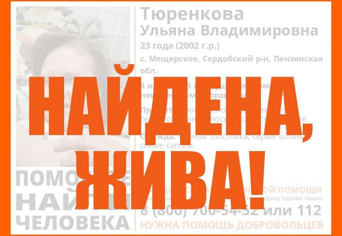 Завершены поиски пропавшей жительницы Сердобского района. 23-летняя Ульяна Теренкова из села Мещерское пропала 4 июня. Ее искали родные, полиция и добровольцы. Сообщалось, что девушка нуждается в медицинской помощи. Участники отряда «Лиза Алерт» проводили поисковую работу, в том числе выезжали на место пропажи. Вечером 8 июня девушка была найдена. «Тюренкова Ульяна, Сердобский район, с. Мещерское, найдена, жива! Большое спасибо каждому за участие в поиске и любой вклад в общее дело!» - написали представители отряда в своем телеграм-канале. Ранее мы сообщали, что в Пензенской области пропала 69-летняя женщина с потерей памяти. Ольгу Савостьянову ищут близкие, полиция и добровольцы.
