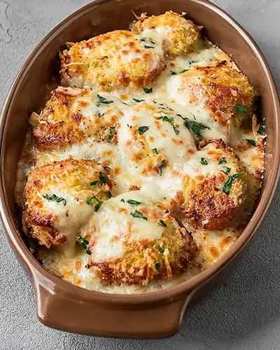 В этом запечённом блюде сочные, нежные куриные грудки сочетаются с насыщенным соусом маринара и моцареллой с пармезаном в качестве начинки. Всё это дополняется чесночными гренками для аппетитного хруста. Свежая посыпка из базилика придаёт блюду яркость, делая его простым и ароматным вариантом классического любимого блюда. Вот рецепт запеченной курицы. Для приготовления нам будут нужны вот эти продукты: 6 половинок куриной грудки без костей и кожи 2 стакана готового соуса маринара четверть стакана измельчённого свежего базилика 225 г тертого сыра моцарелла половина стакана тёртого сыра пармезан 140 г чесночных гренок 2 ст. л. растительного масла 2 зубчика чеснока раздавить и мелко нарезать четверть чайной ложки измельчённых хлопьев красного перца или по вкусу. Время приготовления: 1 час. Все нужные продукты мы собрали. Начинаем готовить запеченную курицу с пармезаном. 1. Разогрейте духовку до 175 градусов. Сбрызните дно формы для запекания размером 23 на 33 см растительным маслом, затем